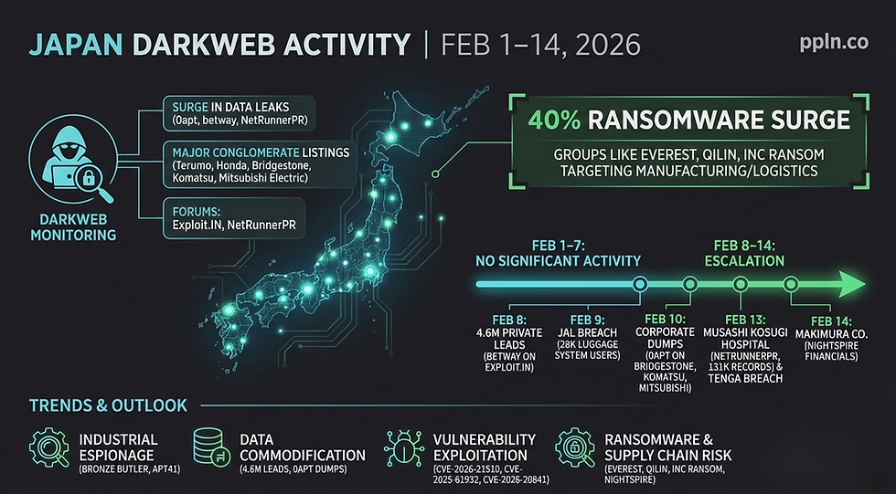 In the period from February 1 to February 14, 2026, darkweb monitoring revealed increased listings and illicit sales targeting Japanese entities, primarily via platforms like Exploit.IN forums. Activities focused on corporate data dumps, personal lead sales, and healthcare breaches, with no significant government leaks observed but one major hospital incident. Escalation was noted mid-February, dominated by threat actors like 0apt and threat actor 'betway'
